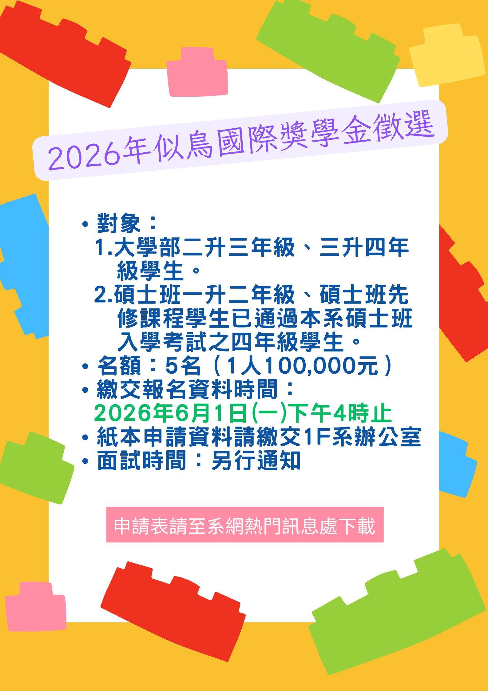 對象:1.大學部二升三年級、三升四年級學生2.碩士班一升二年級、碩士班先修課程學生已通過本系碩士班入學考試之四年級學生 名額:5名(1人100,000元) 繳交報名資料時間:2026年6月1日(一)下午16時止 學習歷程與規劃及獎學金使用規劃重點說明如下:1.将来の目標(就職、研究)2.そのため奨学金受給期にやること *日本語言学習関係 *専題研究 *その他3.その過程で必要な資金とその用途報名表申請簡歷表獎學金辦法