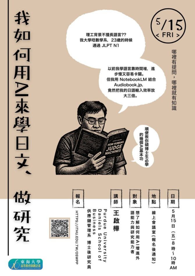 2026年5月15日(五)8:00~我如何用AI來學日文、做研究(線上) 活動資訊, 熱門訊息, 首頁熱門訊息輪播(有圖片)By japanadmin2026-04-10報名網址: https://event.ithu.tw/2026040015